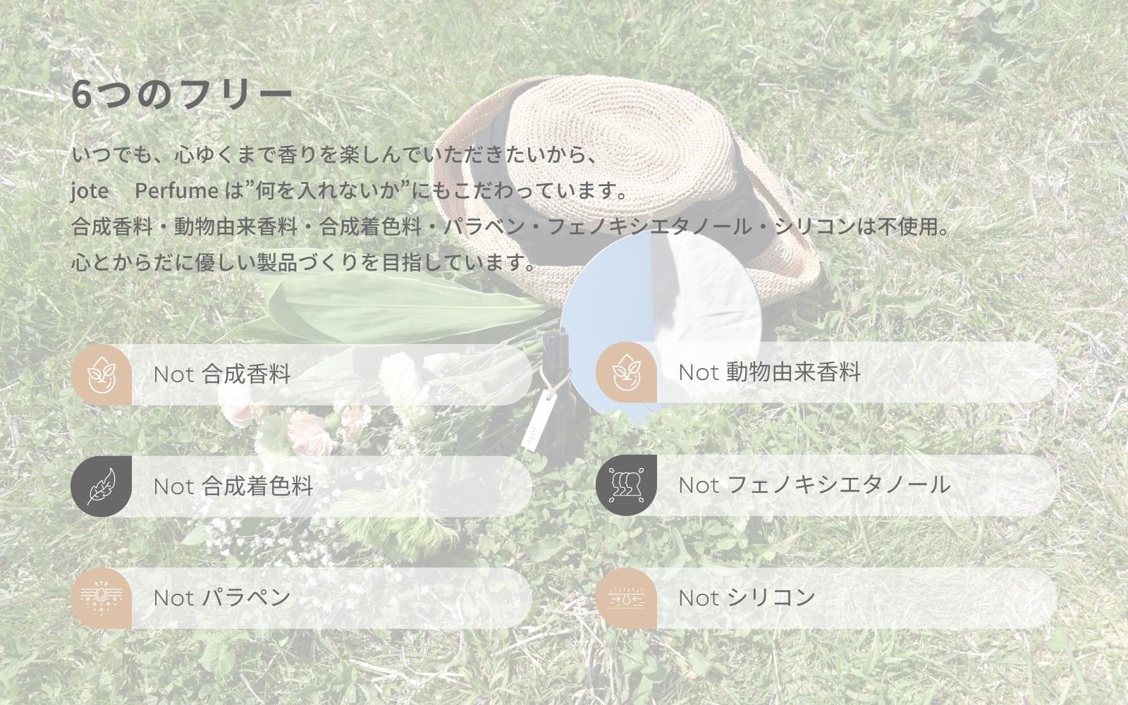 いつでも、心ゆくまで香りを楽しんでいただきたいから、jote は”何を入れないか”にもこだわっています。